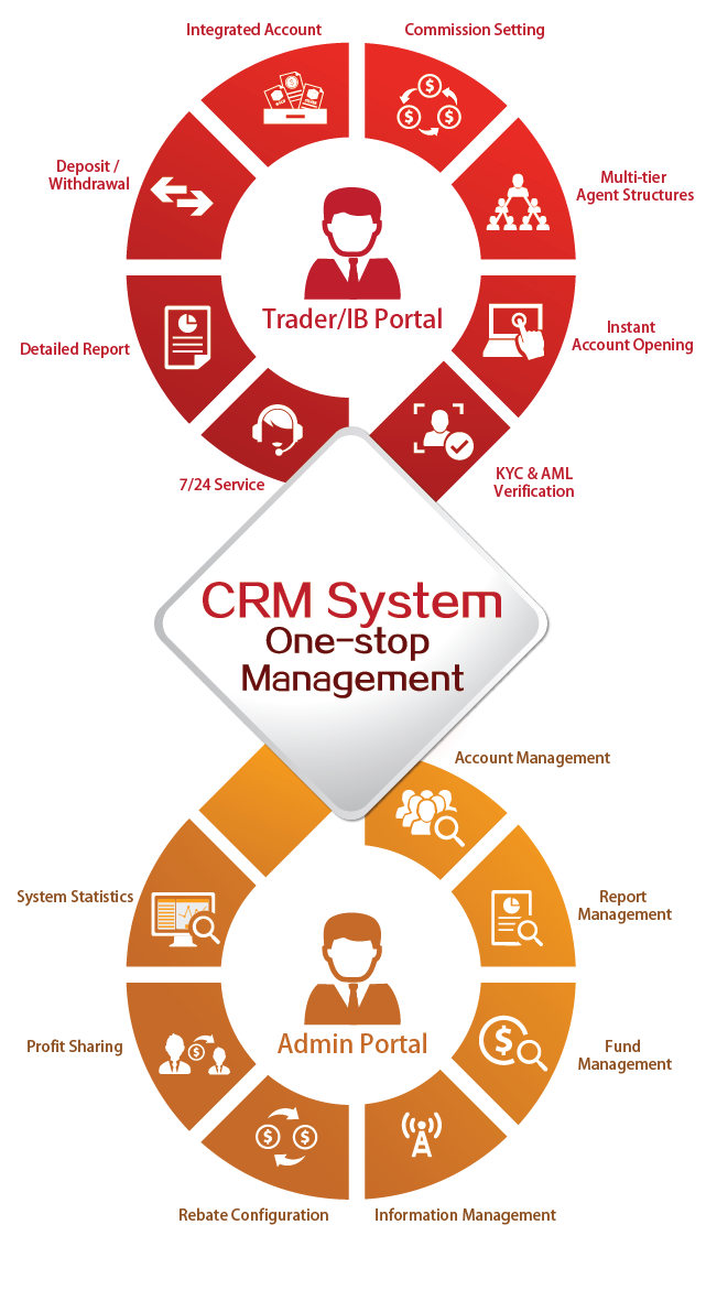 Forex CRM System is a Customer Relationship Management system developed exclusively for facilitating forex/bullion brokerage companies to manage all the Introducing Brokers (IBs) and clients efficiently. It assists to streamline and standardize the operation processes, resulting in reducing costs, improving efficiency and increasing customer retention. The sophisticated cloud-based CRM system integrates seamlessly with MT and mF trading system. It has a full-fledged affiliate system with multi-tier rebate capabilities which allow brokers to grow their brokerage business rapidly.