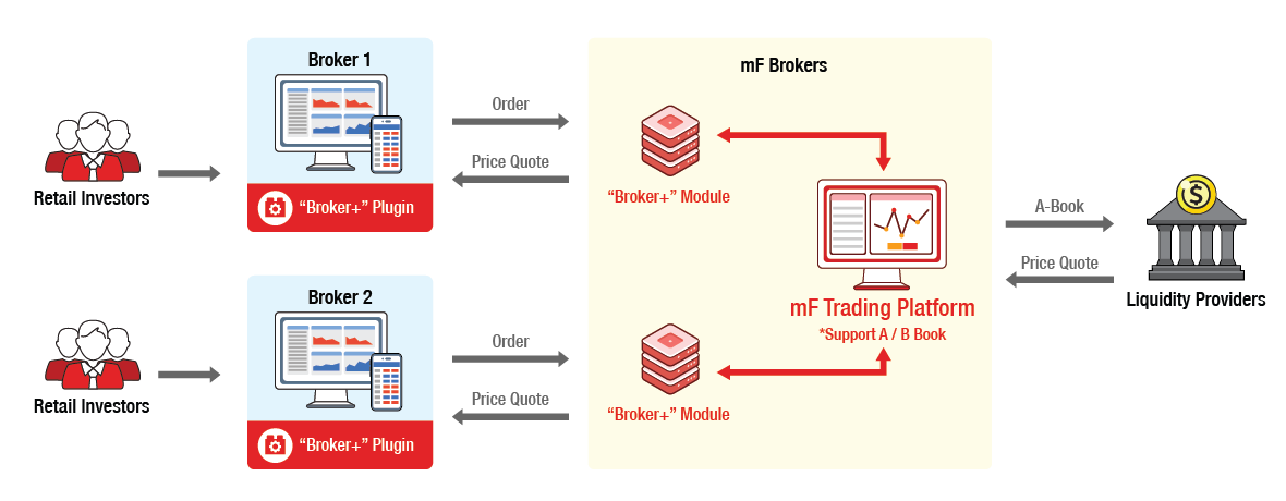 mF brokers can multiply their trading volume by mF trading system to transact the flow from other MT brokers directly via STP