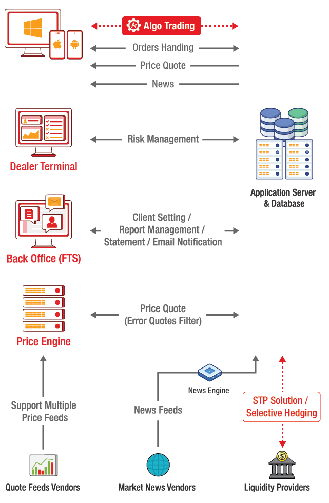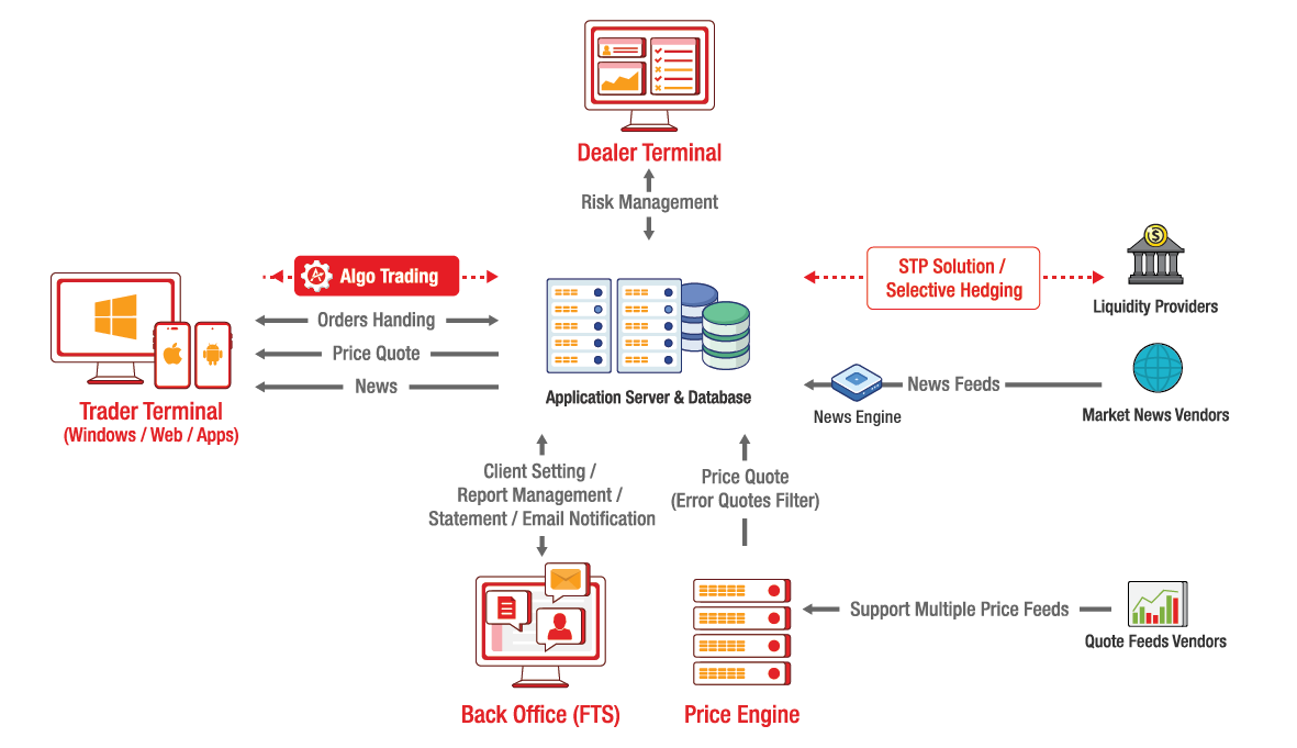 The whole solution includes four modules: Trader Terminal, Dealer Terminal, Back Office, and Price Engine. The trader terminals support web, desktop (in Java and .Net), and mobile apps versions, which suit the needs of all financial institutions. The design concepts of these modules are to allow brokers to have one-stop management of their business, monitor risks and have personalized settings.